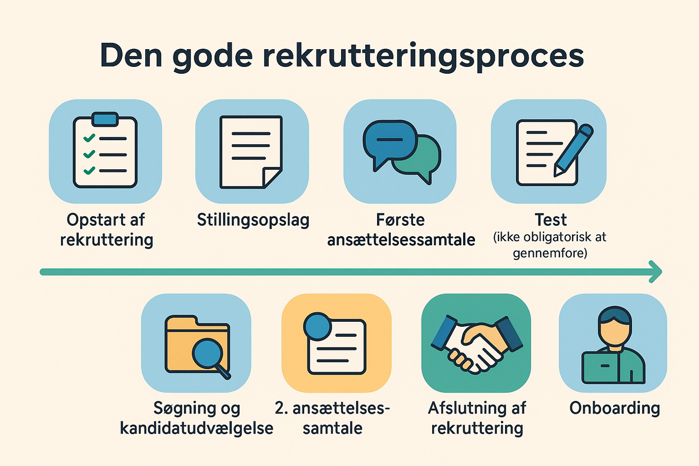 Test og 2. samtale er ikke obligatoriske, men de bør altid indgå ved rekruttering af ledere eller nøglepersoner. Ved basismedarbejdere kan du overveje, om de to trin skal være en del af din proces.